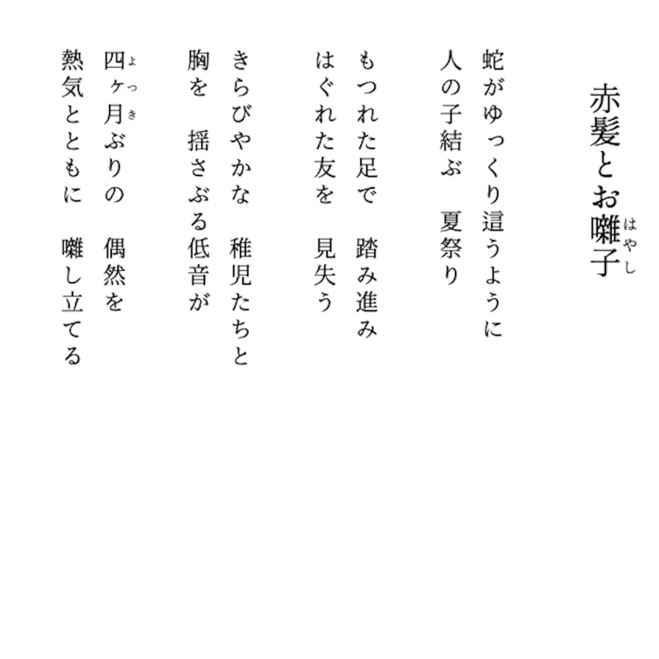 喧騒渦巻く夏祭りの夜、人混みを縫うようにして「赤髪」の面影を追う一人の高揚感と切なさを描いた叙情詩。お囃子のリズムが二人の鼓動と重なる。